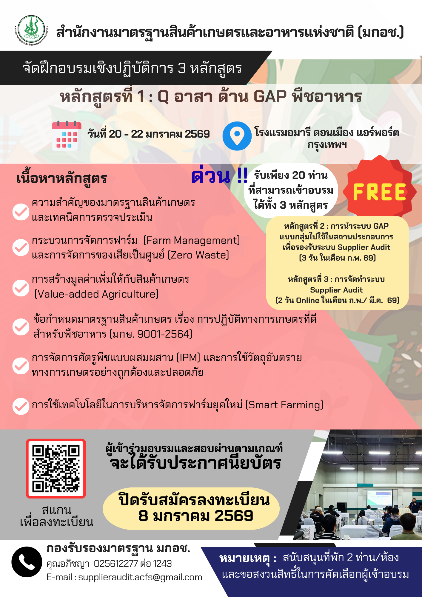 สนง.มาตรฐานสินค้าเกษตรและอาหารแห่งชาติ (มกอช.) จัดฝึกอบรมเชิงปฏิบัติการ 3 หลักสูตร สมัครฟรี ถึง 8 ม.ค. 69