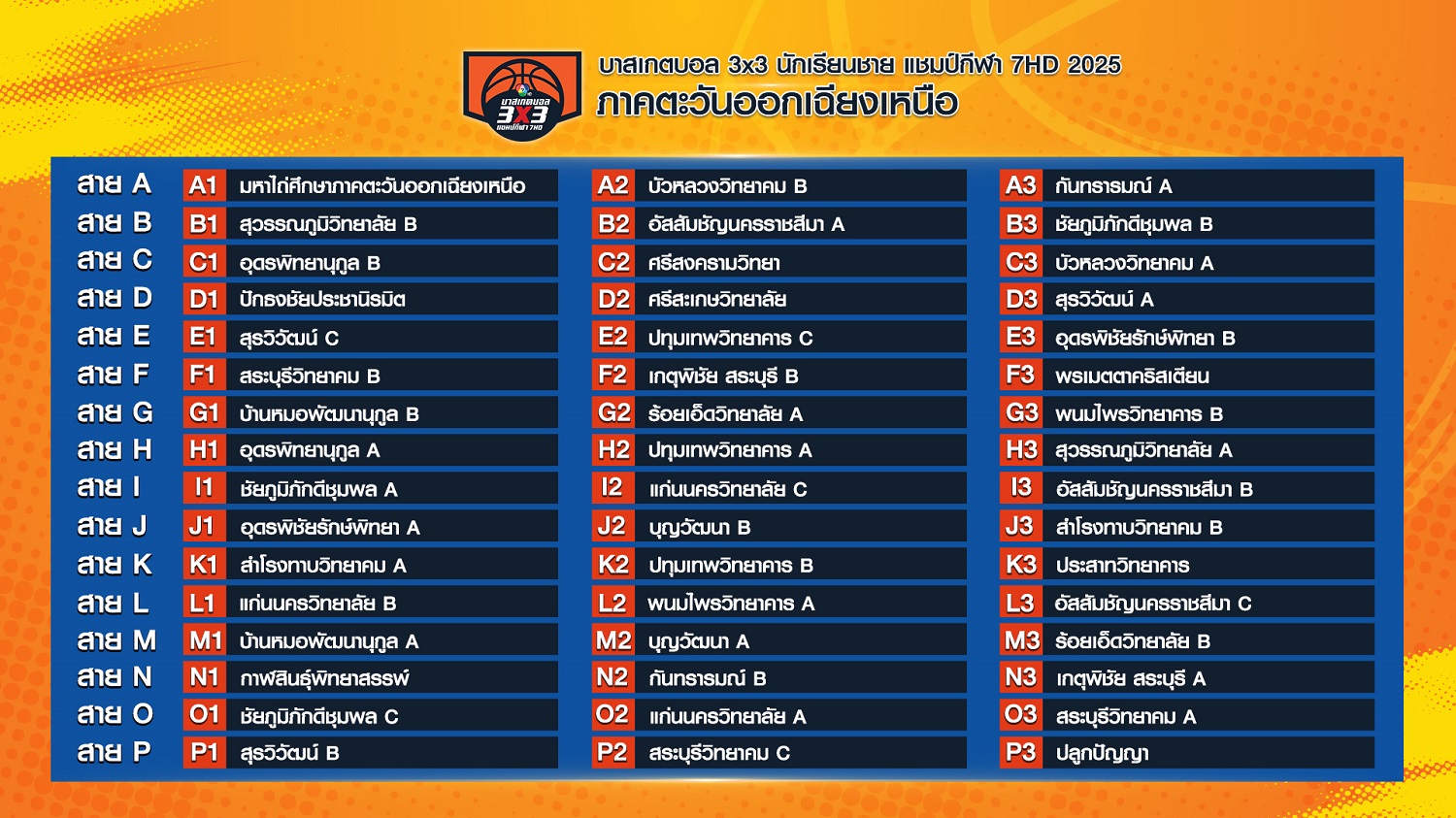 งานนี้แต่ละภาคมีทีมเด็ดดีกรีร้อนแรงอย่างแชมป์ระดับประเทศร่วมลงชิงชัยมากมาย ประเดิมด้วย ภาคตะวันออกเฉียงเหนือหนุ่มน้อยเมืองเกินร้อย สุวรรณภูมิวิทยาลัย จ.ร้อยเอ็ด พ่วงตำแหน่งแชมป์บาสเกตบอลชาย 3×3 กีฬาเยาวชนแห่งชาติภาคอีสาน ขณะที่ภาคเหนือ มีทีมละอ่อนฟอร์มฮอต มงฟอร์ตวิทยาลัย จ.เชียงใหม่ ดีกรีอันดับ 3 กีฬาเยาวชนแห่งชาติ ส่วนภาคกลาง-กรุงเทพฯ และปริมณฑล มีแชมป์กีฬานักเรียนนักศึกษาแห่งประเทศไทย ปี 2568 และตัวแทน 3×3 นักเรียนไทยชิงชนะเลิศแห่งเอเชียใต้ อย่างทีม นนทบุรีวิทยาลัย จ.นนทบุรี ปิดท้ายที่ภาคใต้ ได้ทีมบาสเกตบอล โรงเรียน