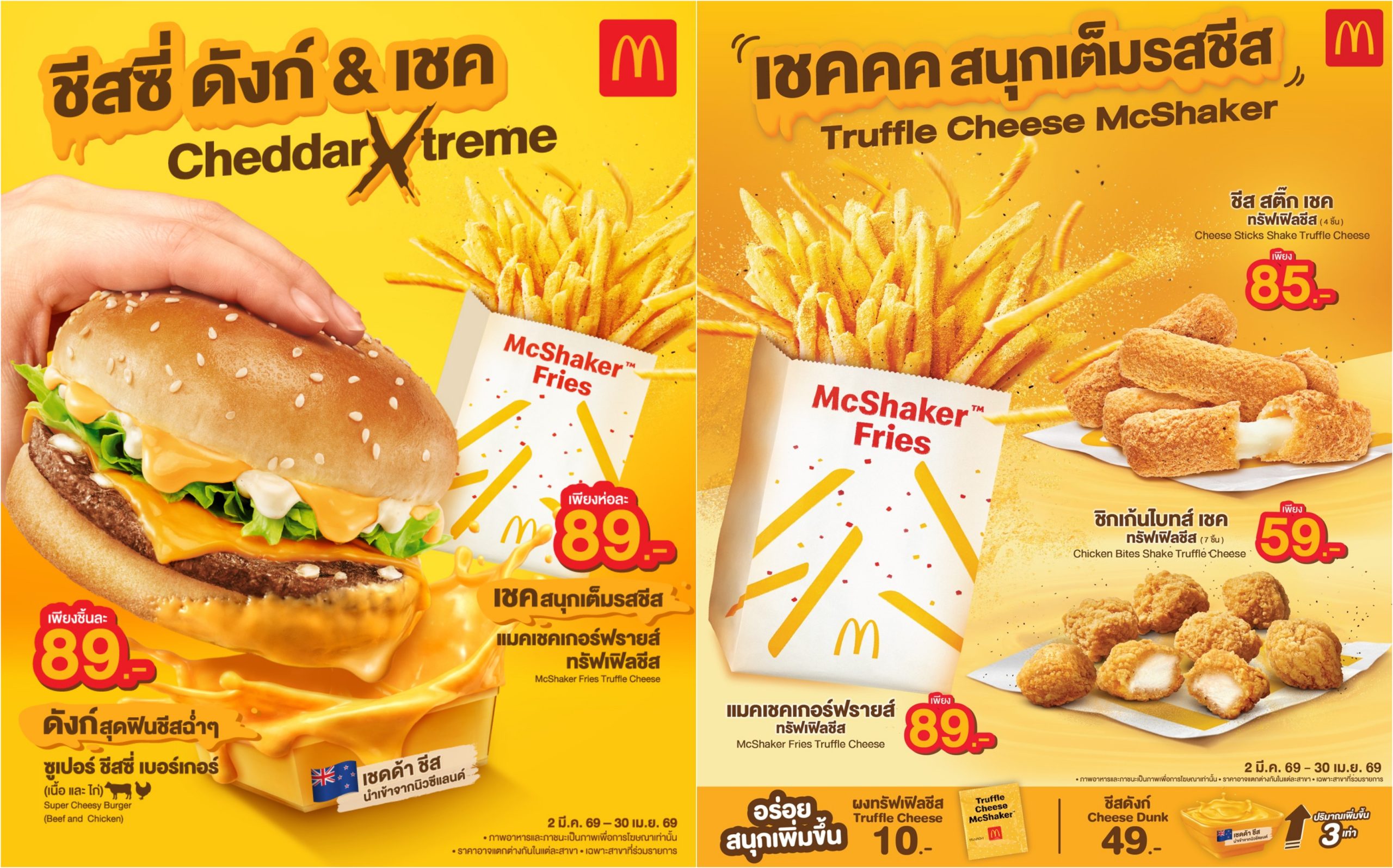 แมคโดนัลด์ นำแคมเปญสุดปังกลับมาอีกครั้ง! เสิร์ฟความฟินชีสขั้นสุด กับแคมเปญ ‘ชีสซี่ดังก์ & เชค’ เชดด้า เอ็กซ์ตรีม เอาใจชาวชีสเลิฟเวอร์ด้วย ‘ซูเปอร์ชีสซี่ เบอร์เกอร์’ เลือกอร่อยได้ทั้งเบอร์เกอร์เนื้อหรือไก่ชิ้นใหญ่เต็มคำ พร้อมชีสสเปรดและชีสสไลซ์แบบจัดเต็ม ราคาเริ่มต้นชิ้นละ 89 บาท และความอร่อยแบบดับเบิ้ลเอาใจสายเนื้อกับ ‘ดับเบิ้ลชีสซี่ เบอร์เกอร์เนื้อ’ จัดเต็มเนื้อฉ่ำๆ พร้อมเชดด้าชีสล้นๆ ราคาเริ่มต้นชิ้นละ 129 บาท พิเศษสุด! ทุกเมนูสามารถเลือกจับคู่ฟินกับ ชีสดังก์ ที่ทำจากเชดด้าชีสแท้นำเข้าจากนิวซีแลนด์ ให้ดังก์ชีสกันฉ่ำๆ ปริมาณจุใจกว่าปกติถึง 3 เท่า เพียงถ้วยละ 49 บาท หรือ อิ่มฟินสุดคุ้มกับ ‘ชุดซูเปอร์ชีสซี่ เบอร์เกอร์’ (เนื้อหรือไก่) พร้อม ชีสดังก์ 1 ถ้วย, เฟรนช์ฟรายส์ขนาดกลาง 1 กล่อง และโค้ก ขนาด 16 ออนซ์ 1 แก้ว ในราคาเริ่มต้นเพียงชุดละ 179 บาทเท่านั้น