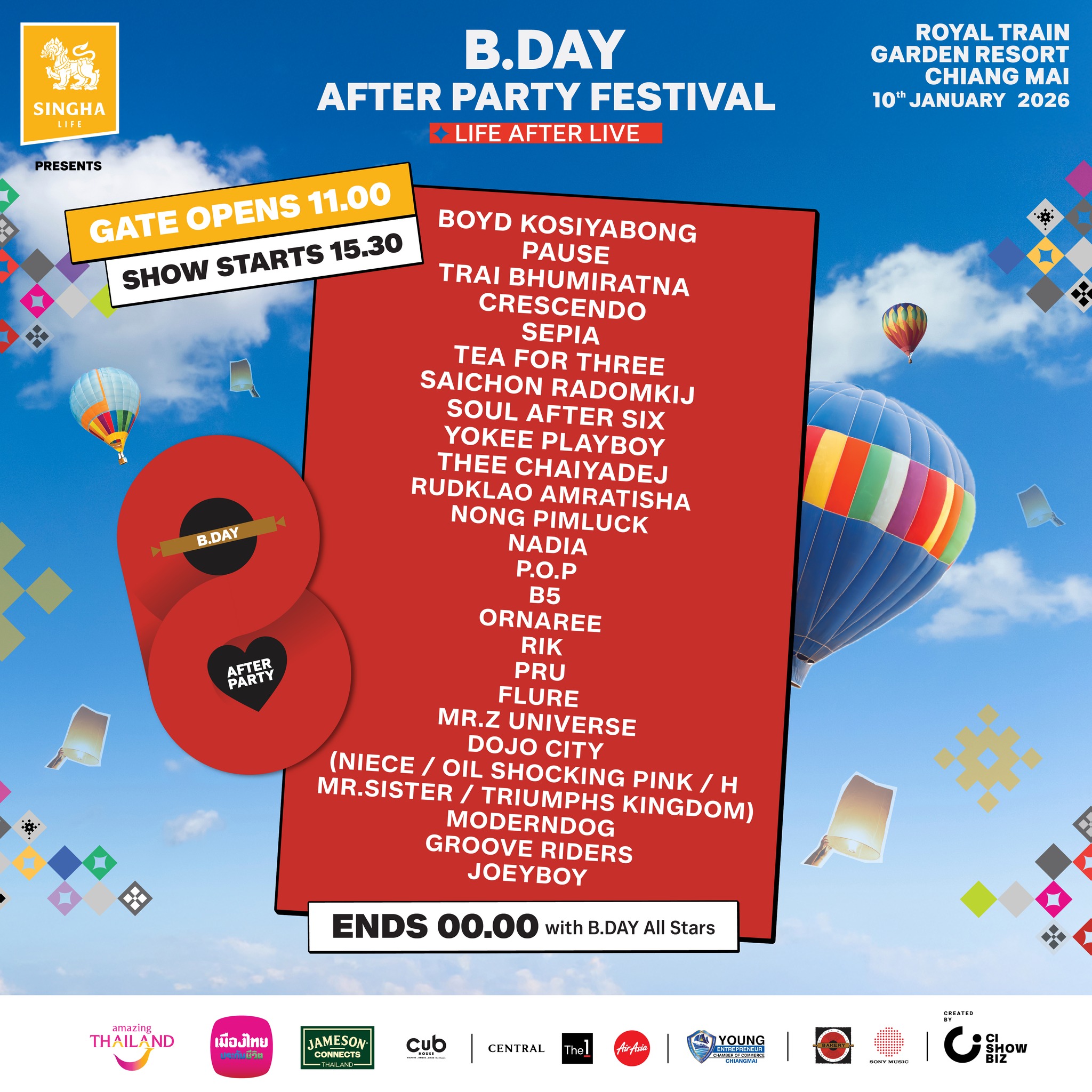 เทศกาลดนตรีกลางแจ้งครั้งยิ่งใหญ่ที่แฟนเพลงไม่ควรพลาด “SINGHA LIFE Presents B.DAY After Party Festival: Life After Live” 🍞 การรวมตัวกันครั้งสุดท้ายแบบครบศิลปินจากค่าย Bakery Music & Dojo City มาร่วมท้ารับลมหนาว เต็มอิ่มกับเพลงฮิตจุใจกว่า 9 ชั่วโมง เก็บเกี่ยวความสุข สร้างความทรงจำใหม่ไปด้วยกัน ยกทัพศิลปินโดย BOYD KOSIYABONG / PAUSE /…
